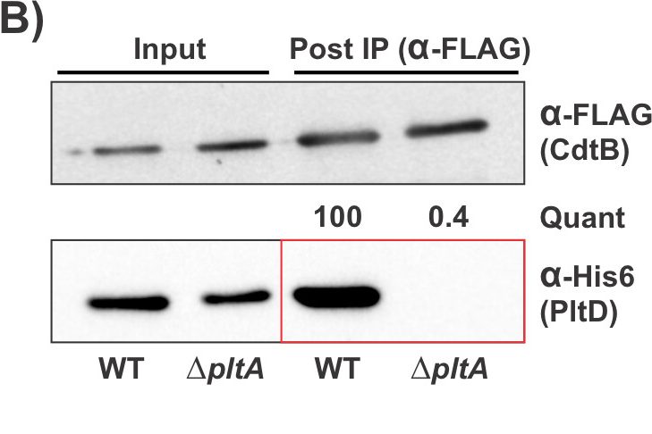 This figure demonstrates that PltD is associated with CdtB in a PltA dependent manner in an immunoprecipitation experimentation with S. bongori.